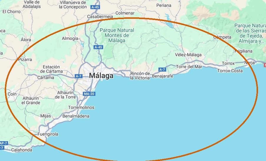 Trabajamos en: Málaga, Rincón de la Victoria, Torre del Mar, Vélez-Málaga, Torrox, Torrox-Costa, Benajarafe, Chilches, Torremolinos, Benalmádena, Fuengirola, Alhaurín de la Torre, Coín, Churriana, Cártama, Estación de Cártama, Campanillas, Puerto de la Torre, La Cala del Moral, Algarrobo, Algarrobo Costa, Casabermeja, Marbella, Mijas, Alhaurín el Grande, Pizarra, Algarrobo, Elviria, El Rosario, Nueva Andalucía, La Zagaleta, Sierra Blanca, Los Flamingos, Los Pinares de San Antón, La Cala de Mijas.
